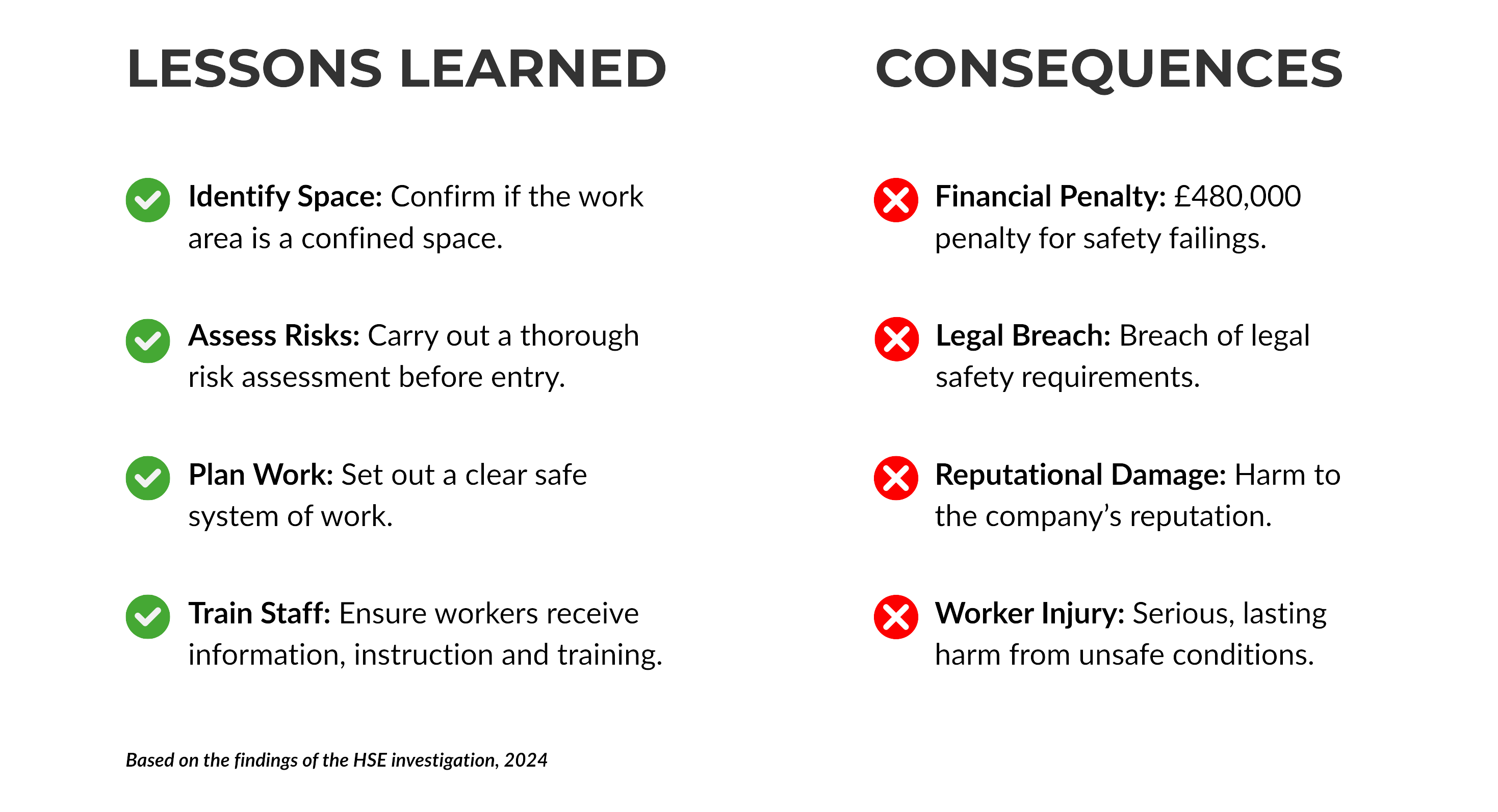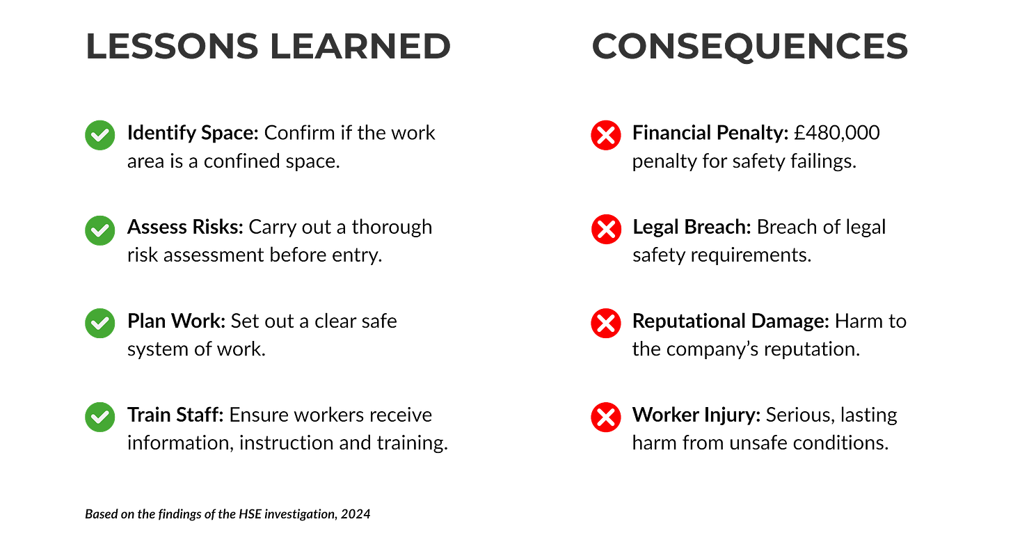 This case highlights the importance of proper planning, risk assessment, and training when working in confined spaces. Non-compliance can lead to serious injury and significant legal and financial consequences.